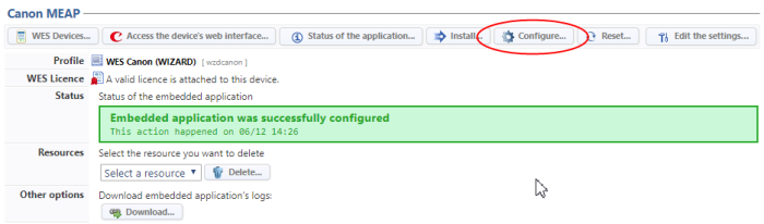 Once the WES profile has been enabled on the queue, the Canon MEAP section appears in the Queue Properties interface. This section contains several buttons: