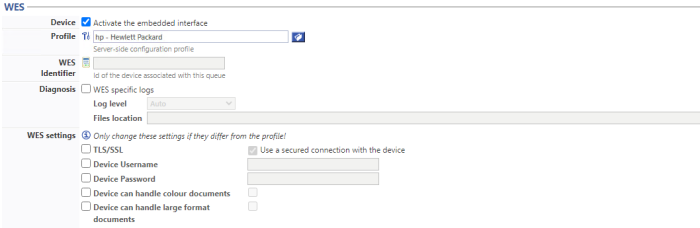 Wes Settings subsection: Use this section to configure the connection settings between the WES and Watchdoc in cases where the connection is a secure one, so that you can override the device username, password and the type of connection that is configured in the instance just for one queue: