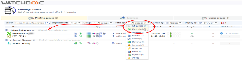 è This takes you to the print queues interface. In this queue, activate the Controlled filter, then select the queue you want to configure: