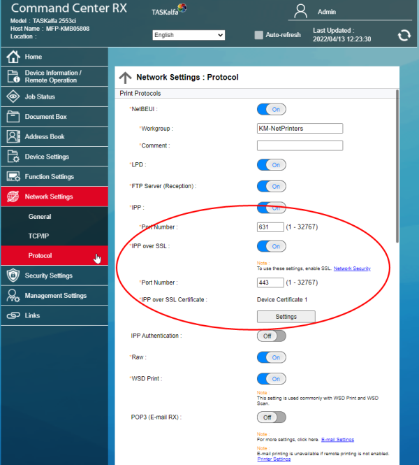 In the section Print Protocols, activate the protocol IPP over SSL keep the IPP port 443 displayed by default: