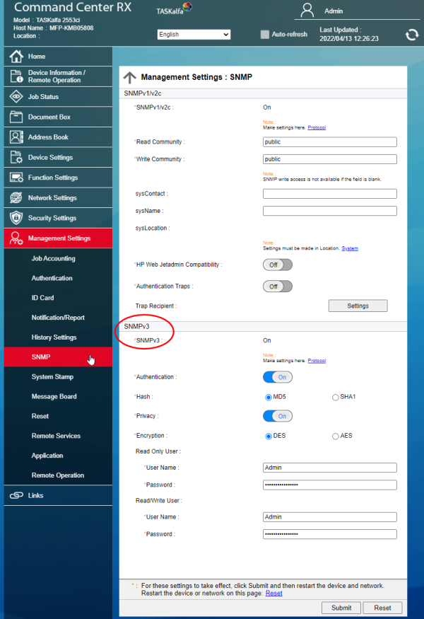This step is only required when configuring the ScanToMe feature or if you want to use the Kyocera Net Viewer to configure the device.