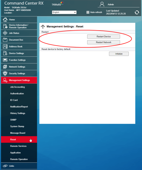 using a browser, open the device administration web site (http: // device_ip) and log in as an administrator;