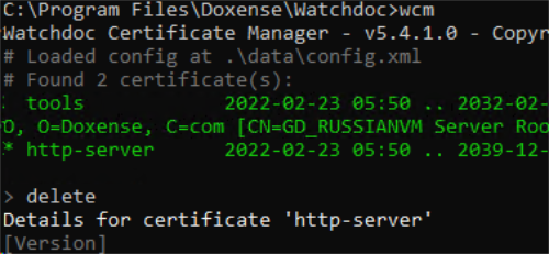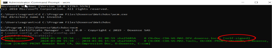 Cd C:\Program Files\Doxense\WatchdocC:\Program FilesDoxense\Watchdoc>wcmWCM displays information indicating that the http-server certificate is self-signed: