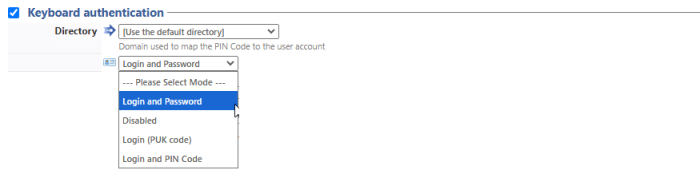 Keyboard authentication: tick the box (at the section level) to enable user authentication from a physical keyboard or the touch screen one, then set out how this authentication works: