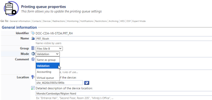 Mode: select Validation to have users validate queued jobs so that they are actually printed. If the queue belongs to a group configured in Validation mode, you can also select Same as Group.