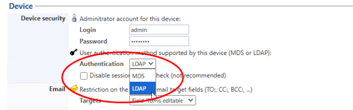 If your Toshiba device does not support the MDS authentication mode, you can use the traditional LDAP authentication mode.