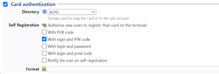 Card authentication: tick the box (at the section level) to enable user authentication from a card, then set out how this authentication works: