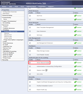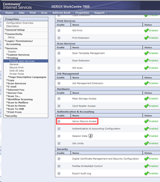 in the Authentication and Accounting section, verify that the Xerox Secure Access box is ticked;