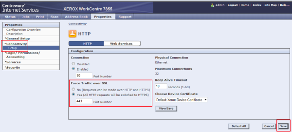 in the HTTP interface, for the Force Traffic over SSL setting, select Yes and keep the 443 default port;