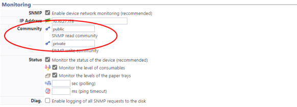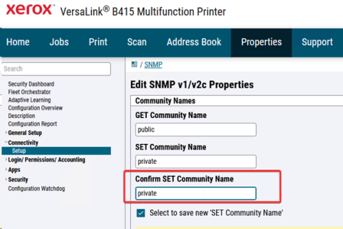 in the Community section, verify that the SNMP read community and the SNMP write community values are the same as those of the device. If necessary, change them to be the same:
