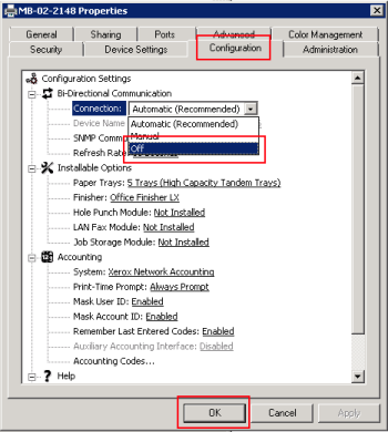 By default, "bidirectionality" mode is enabled on the print server. As a result, the driver's accounting mode is synchronized with that of the device. For Watchdoc to work properly, it is necessary to disable this mode on the driver and