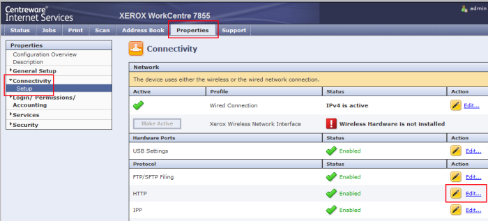 From the device administration web interface, go to the Property > Connectivity > Installation tab;