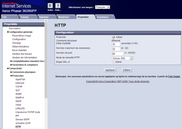 from the device web administration interface, go to the Properties > Connectivity > Protocoles > HTTP tab;