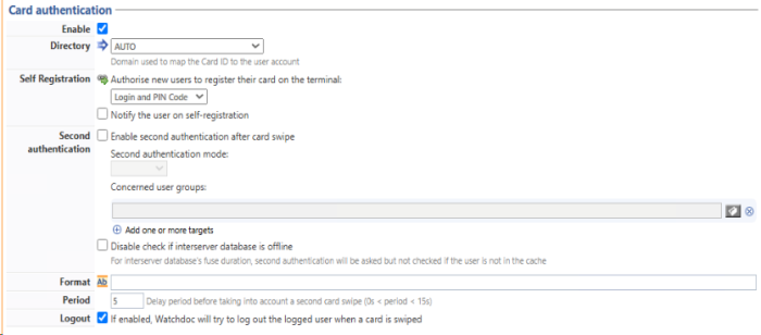 Directory: From the list, select the directory to query during cards authentication. If no directory is set, Watchdoc will query the default directory.