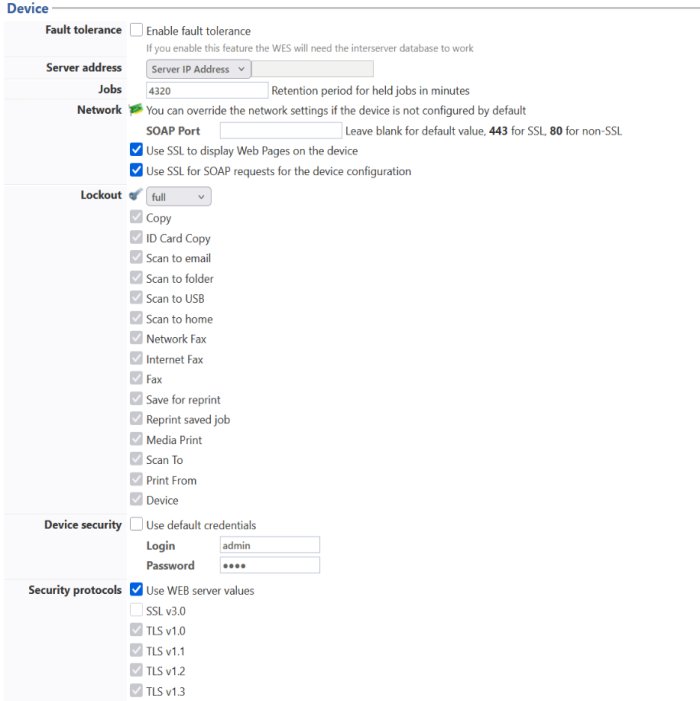 Device security: tick the box if you are using the default identifiers or specify the device administrator account (login) and password that Watchdoc needs to communicate with the device for certain operations (automatic installation, SOAP requests, etc.).